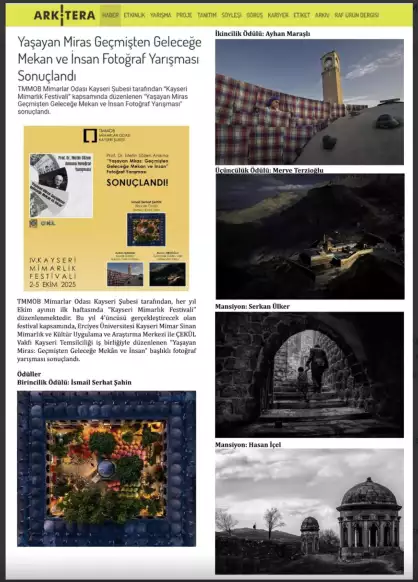 Erciyes Üniversitesi Kayseri Mimar Sinan Mimarlık ve Kültür Uygulama ve Araştırma Merkezi, TMMOB Mimarlar Odası Kayseri Şubesi ve ÇEKÜL Vakfı Kayseri Temsilciliği iş birliğiyle düzenlenen “Yaşayan Miras: Geçmişten Geleceğe Mekân ve İnsan” başlıklı fotoğraf yarışması sonuçlandı. TMMOB Mimarlar Odası Kayseri Şubesi tarafından düzenlenen “Kayseri Mimarlık Festivali” nde Düzeneleme Kurulu Üyeleri ve Jüri Üyelerine plaketleri takdim edildi.