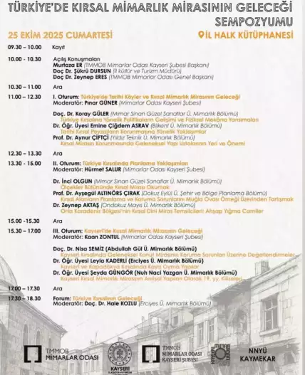 ERÜ Mimar Sinan Merkezi ile TMMOB Mimarlar Odası Genel Merkez, Kayseri Şubesi, İl Kültür ve Turizm Müdürlüğü ve NNYÜ Kaymekar işbirliği ile 25 Ekim Cumartesi günü İl Halk Kütüphanesinde "Türkiye'de Kırsal Mimarlık Mirasının Geleceği Sempozyumu düzenlendi. Sempozyuma Mimarlar Odası Genel Başkanı Zeynep Eres, Mimarlar Odası Kayseri Şube Başkanı Murtaza Er, İl Kültür ve Turizm Müdürü Şükrü Dursun ve 8 farklı üniversiteden konuşmacının yanı sıra çok sayıda öğrenci, akademisyen ve mimar katılım sağladı.